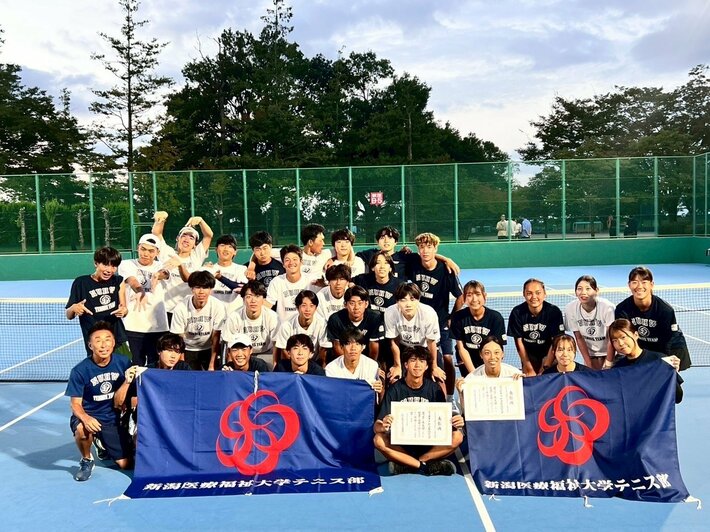 NSGグループの新潟医療福祉大学:テニス部は、9月13日(土)~15日(月)に富山県常願寺公園コートほかにて開催された「令和7年度北信越大学対抗テニス王座決定試合」に出場しました。男子団体、女子団体ともに優勝を果たし、男子は3年連続、女子は2年連続の北信越制覇となりました。 この結果、10月22日(水)より愛媛県総合運動公園テニスコートにて開催される、大学テニスの日本一を決定する「全日本大学対抗テニス王座決定試合」への出場が決定いたしました。