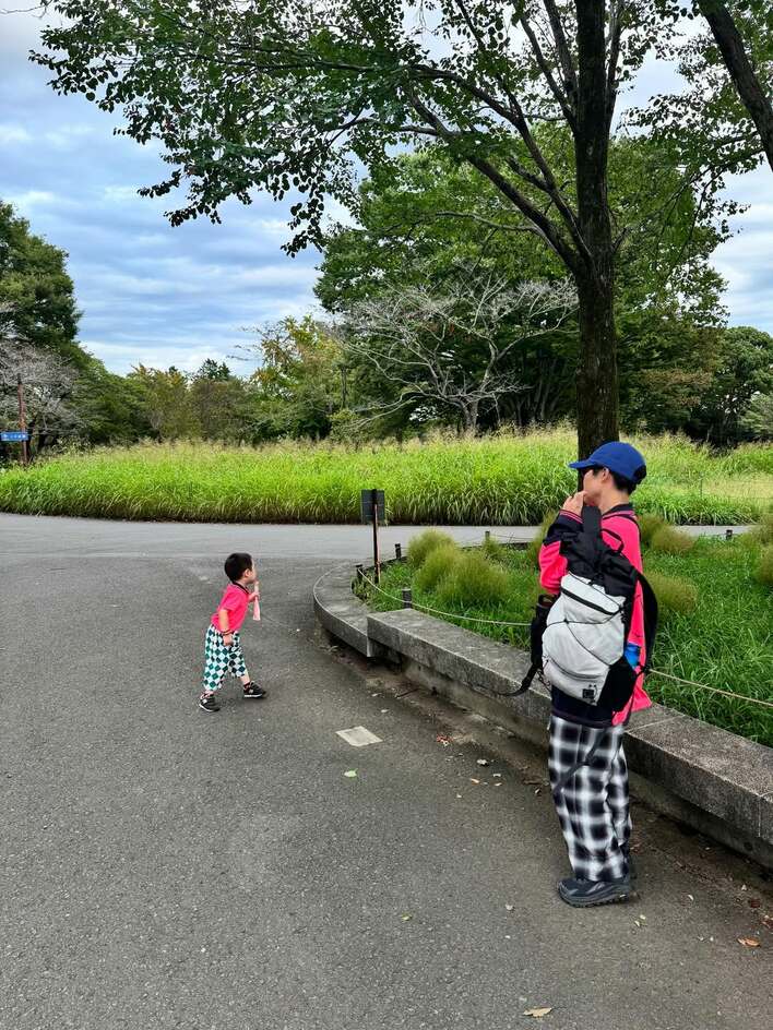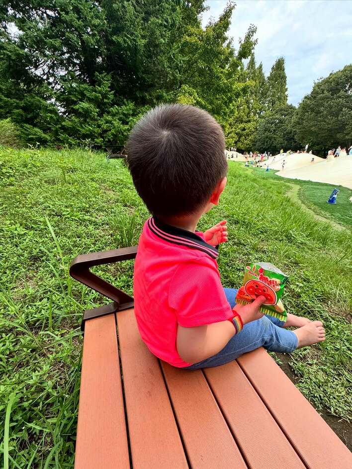 そして、ベンチに座ってお菓子を食べる、息子の後ろ姿も公開。