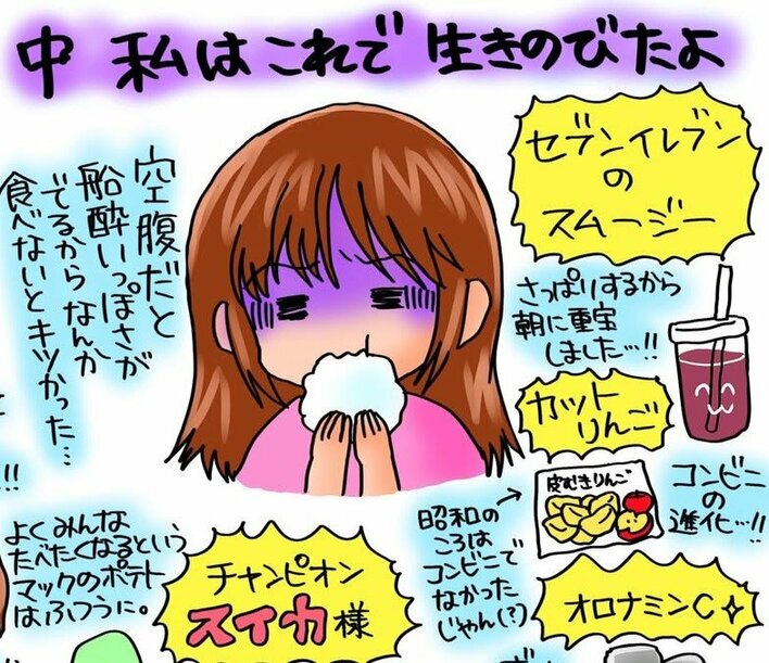 「今日はつわりの時にこれで生き延びた!ものたちを描いてみたよ」と、イラストには青ざめた表情でおにぎりを食べる中川さんが描かれています。「空腹だと船酔いっぽさがでるから なんか食べないとキツかった…」と明かしています。