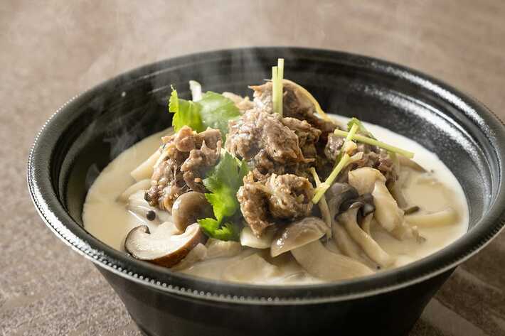 豆乳肉うどん 1,500円味の決め手は、国産大豆をブレンドした自家製の豆乳と、うかい独自の基準で選び抜かれた黒毛和牛「うかい特選牛」から引いたコンソメで仕立てたコク深い豆乳コンソメスープ。うかい特選牛しぐれ煮と4種のきのこを、のどごしなめらかな豆乳うどんの上にたっぷりと盛り付けました。
