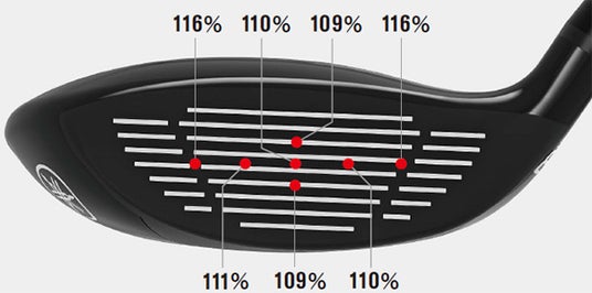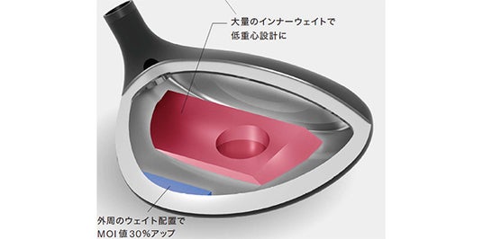 フェアウェイウッドには、フェース素材に高強度のC300マレージング鋼を採用し飛びが進化しました。また、前モデル比でフェースの厚さを25%薄型化し、反発性能が10%向上しています。さらに、偏肉フェースにより打点部(地面から16mm)の反発性が特に進化しています。一方で、扱いやすいサイズ感はそのままに、さらなる低重心化による高い打ち出しを実現し、ヘッドの慣性モーメントが前モデル比で約30%拡大したことによる方向安定性も備えています。加えて、フェース粗さを強化し、スコアラインの細かなピッチでボールを喰いつかせることで、スピンの安定を図っています。