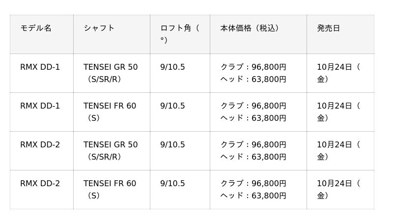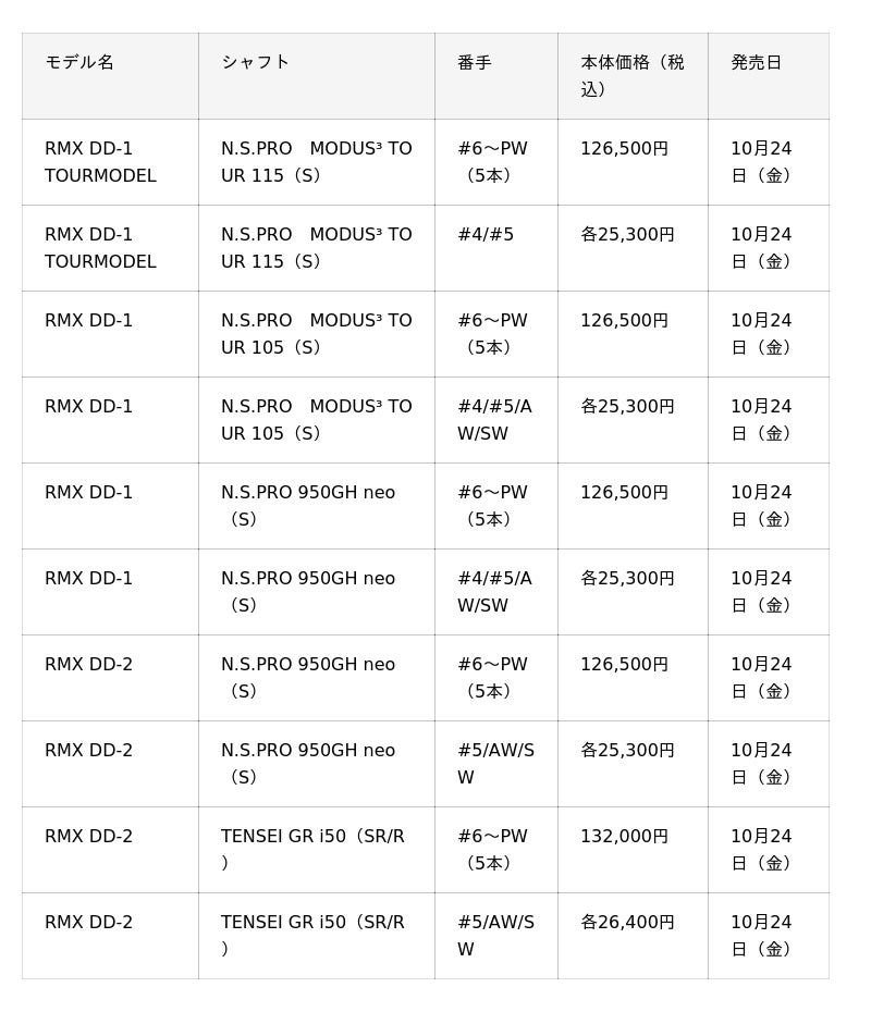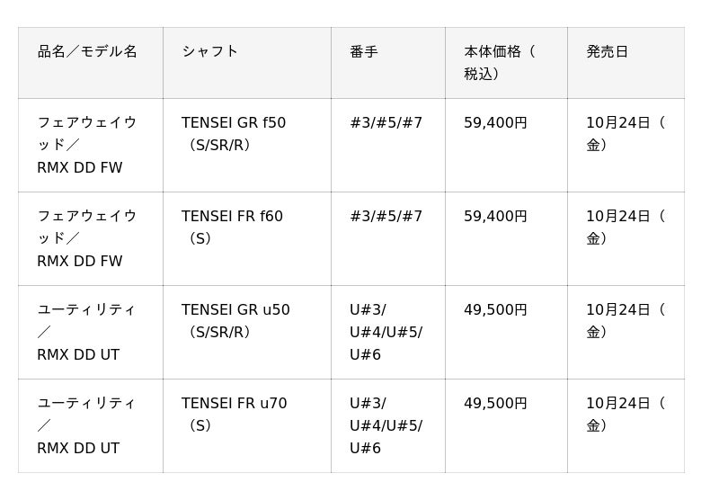 各クラブの主な仕様に関しては、下記製品ページをご覧ください。『RMX DD-1』ドライバー
