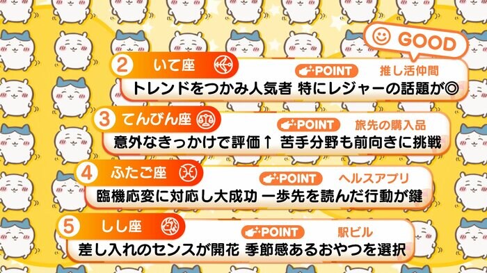 『めざましテレビ』で放送中の「ちいかわ占い」 テレビ放送がない日はお休みで、月~土:朝7時以降に更新予定です。