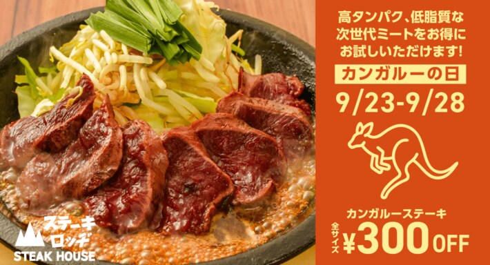株式会社ファイブグループ(本社:東京都武蔵野市、代表取締役社長:坂本 憲史)の関連会社である株式会社B級グルメ研究所(東京都武蔵野市:代表取締役社長 坂本憲史)が運営するステーキハウス『ステーキロッヂ』では、9月23日(火・秋分の日)~28日(日)の期間中、「カンガルーステーキ」を300円引きで提供します。さらに期間中に限り、カンガルー肉と相性の良い「ジンジャーソース」が登場。まだカンガルー肉を体験したことがない方でも美味しく食べられる1皿をお得にご用意いたします。