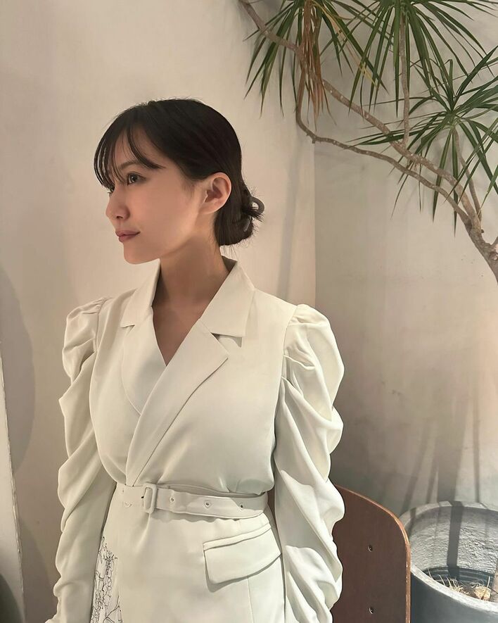 投稿された写真には、袖がパフスリーブデザインでベルトでウエストマークされた白いトップスに身を包んだ田中さんの姿が。チラッと鎖骨をのぞかせ、髪の毛を後ろで1つに束ねた姿は大人っぽさが目を引きます。