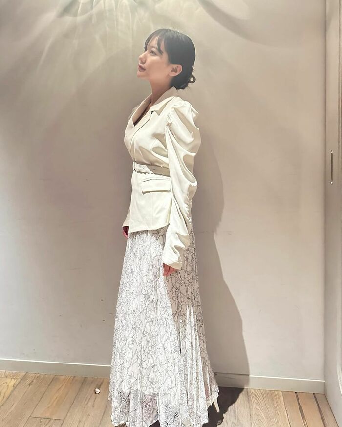 花柄が全面に描かれたスカートを履き、横を向いた全身ホワイトコーデなどが公開されています。