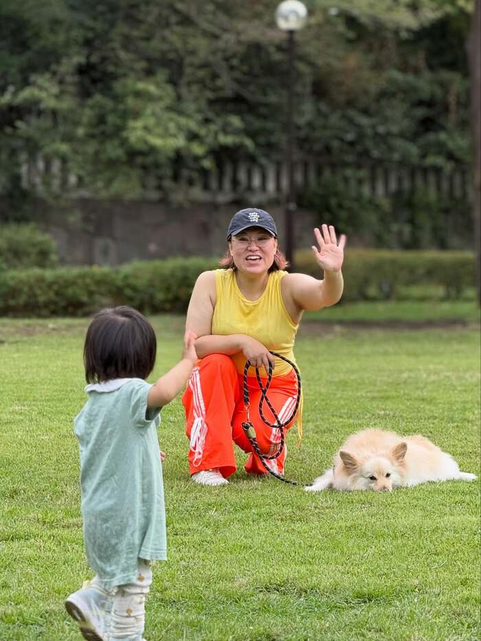 芝公園では、肩ひざ立ちで手を上げ娘を呼ぶような仕草を見せるバービーさんの横で愛犬がふて寝するショットを公開。そんな写真を見てバービーさんは「写真を見返すと英語でしつけするドッグトレーナーみたいな服装だね 夫には「景観法に抵触しそうな服装だね」と言われました。」とコメント。