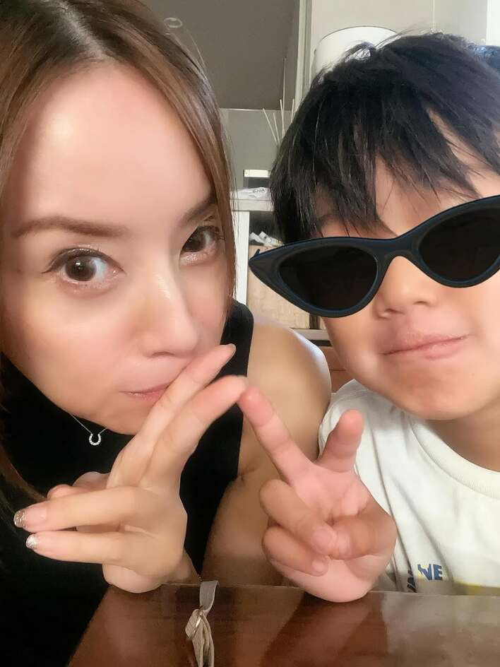 目元にサングラスのスタンプが押された長男と顔を寄せ合い、二人でカメラに超接近する姿を見せました。
