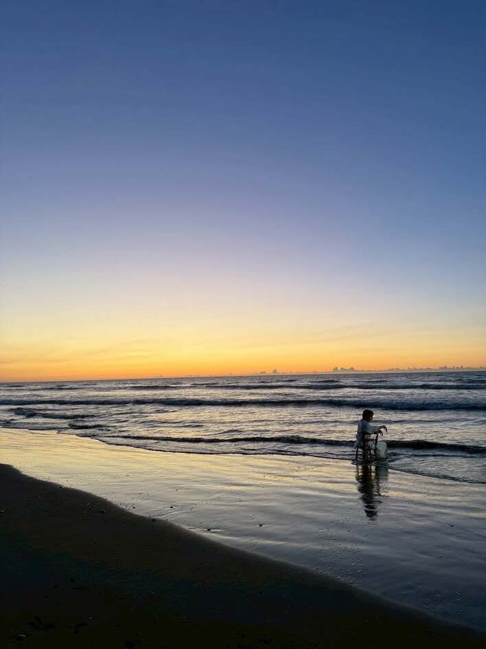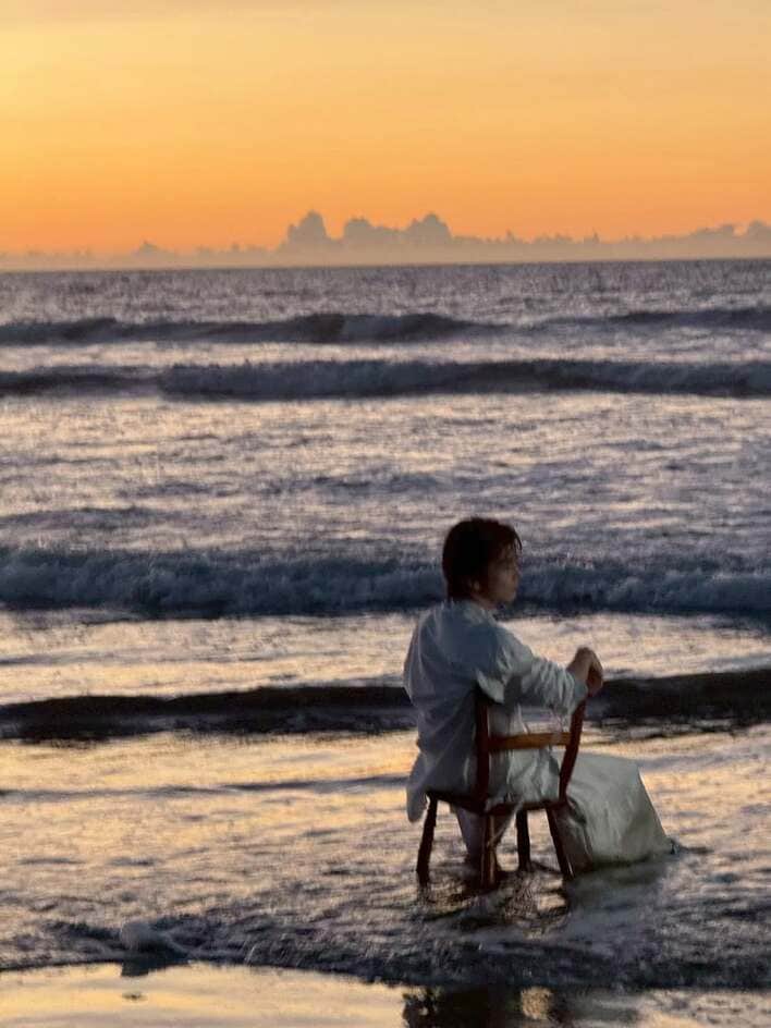 全身真っ白な衣装に身を包み、小さな波が足元まで押し寄せた波打ち際で、椅子に腰を掛けてじっと遠くを見つめています。