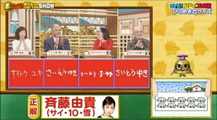 正解は「斉藤由貴(サイ・10・雪)」。見事全員正解!