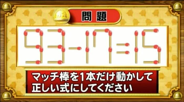 次は、マッチ棒問題。次の式のマッチ棒を1本だけ動かして正しい式にしてください。