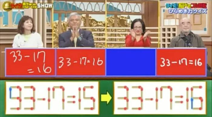 正解は、まず左の式の「9」の1本を動かし「3」にします。その1本を右の式の「5」に足して「6」にします。そうすれば「33-17=16」となります。羽野さん、小西さん、三浦さんが正解!