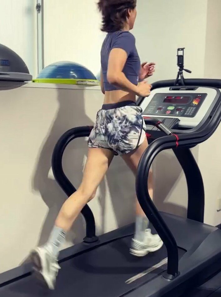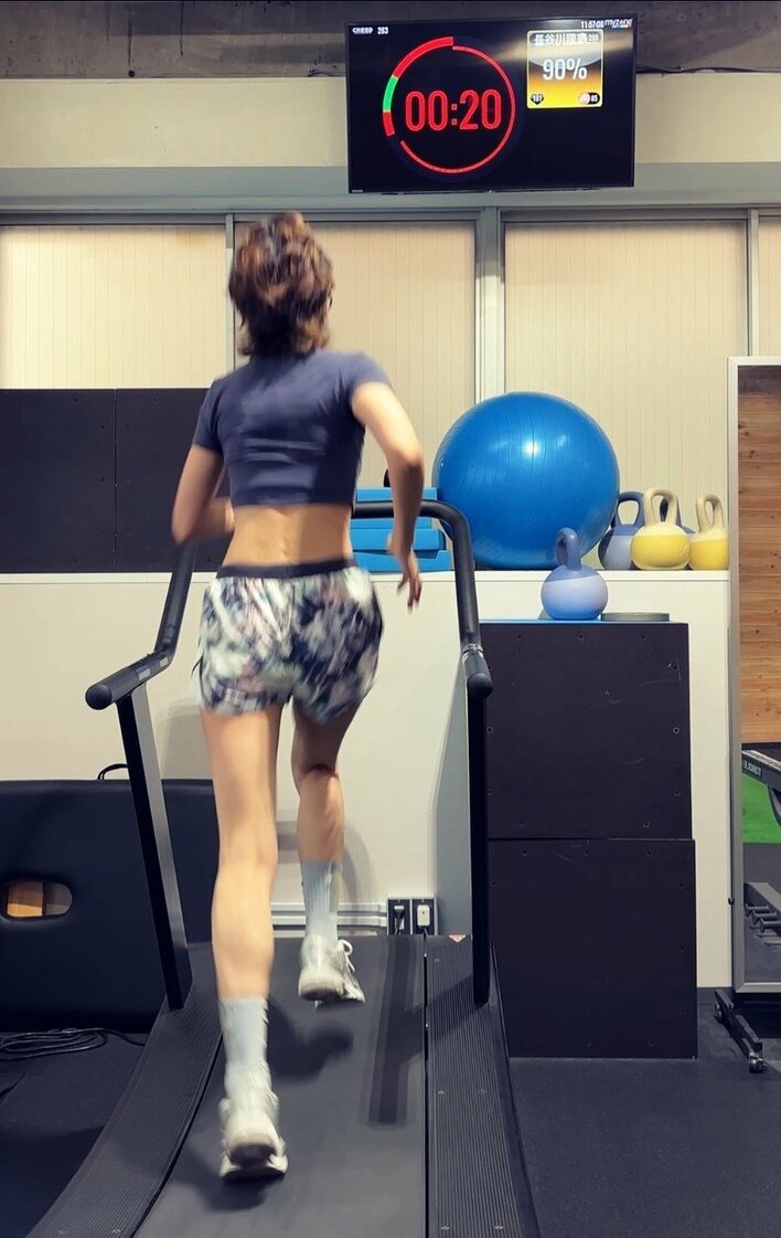 ショート丈トップスと短パン姿の長谷川さんは、前方にある大きなモニターで運動状況を確認しながらランニングマシンでの運動に励んでいるようです。