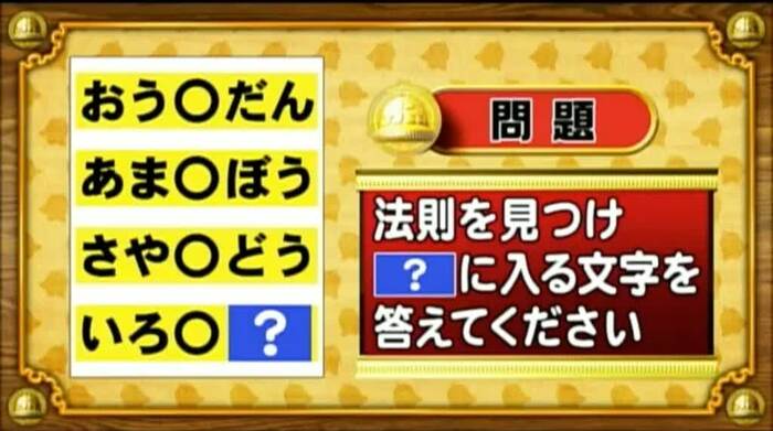 次は、穴埋め法則の問題。法則を見つけ「?」に入るひらがなを答えてください。