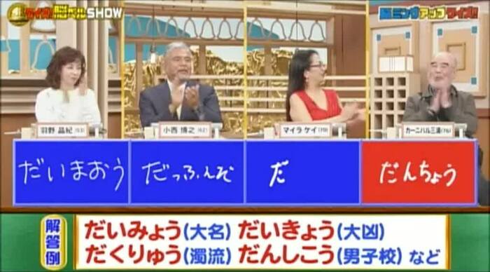 正解は「だいみょう(大名)」「だいきょう(大凶)」「だくりゅう(濁流)」「だんしこう(男子校)」など。「だんちょう」と書いた三浦さん1人が見事正解!