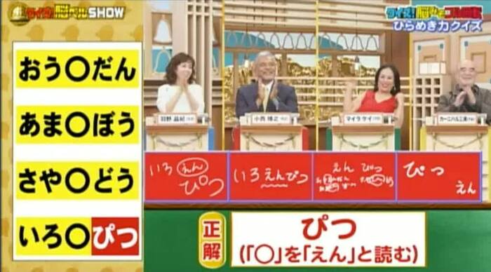 正解は「ぴつ(『○』を『えん』と読む→『いろえんぴつ』)」。見事全員正解!