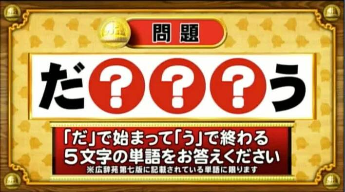最初は「脳ミングアップクイズ」から、頭とお尻言葉の問題。「だ」で始まって「う」で終わる5文字の単語を答えてください。