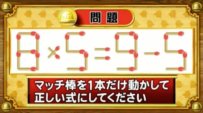 最後は、マッチ棒問題。次の式のマッチ棒を1本だけ動かして正しい式にしてください。