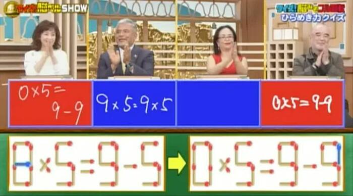 正解は、まず左の式の「8」から1本を動かし「0」にします。その1本を右の式の「5」に足して「9」にします。そうすれば「0×5=9-9」となります。羽野さん、三浦さんの2人が正解。