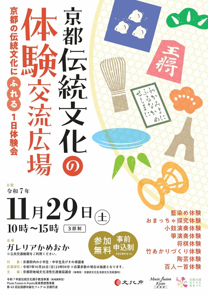 ■京都府等で構成する京都府地域文化活性化連絡協議会では、こどもの頃から文化に親しむ機会を創出し、文化の継承や地域活性化に繋げるために、伝統文化にふれるワークショップイベント「京都伝統文化の体験交流広場」を開催します。
