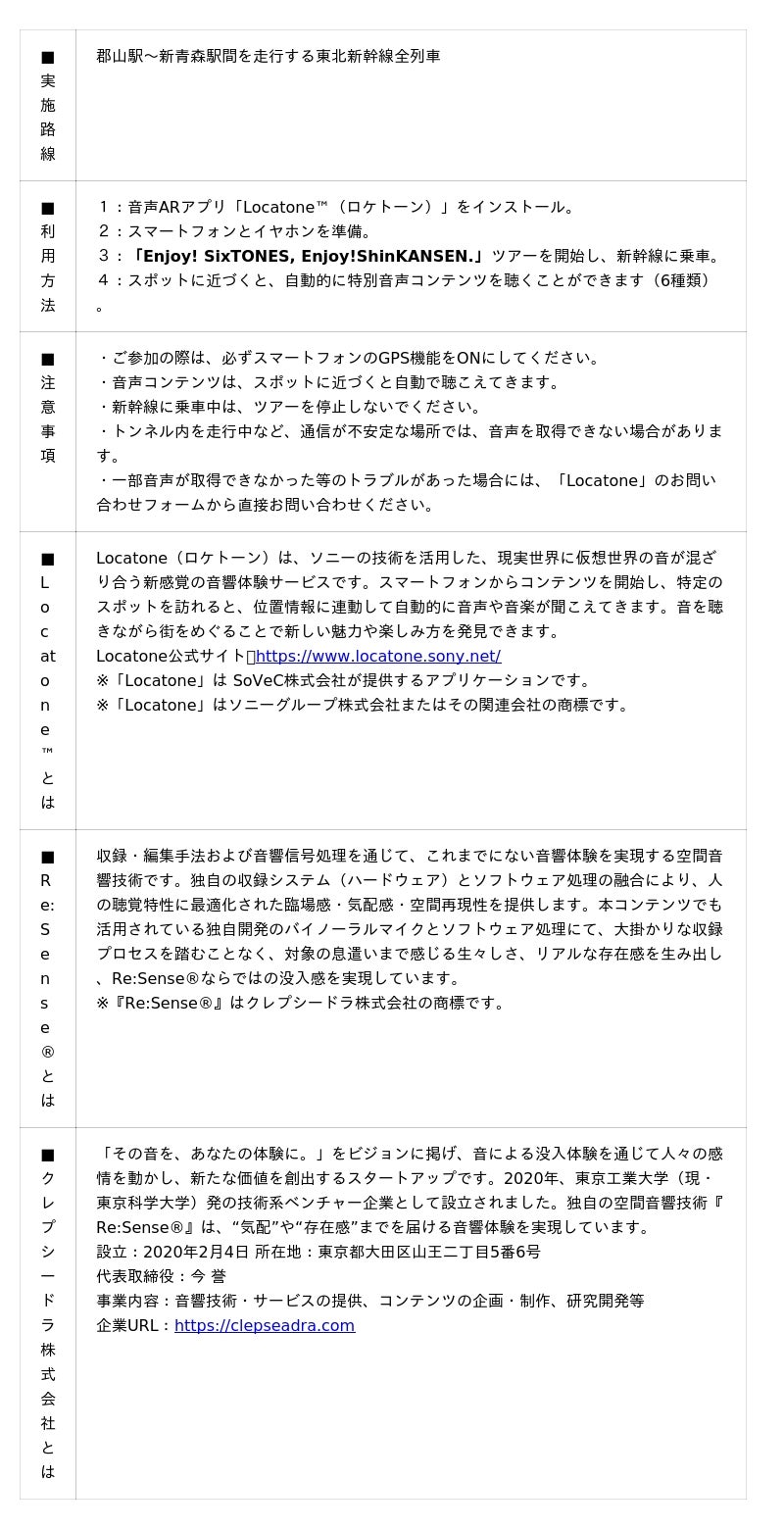 期間中、東北新幹線(郡山駅~新青森駅間)に乗車いただき、音声ARアプリ「Locatone(TM)(ロケトーン)」を利用するとSixTONESメンバー6名による東北各県の見どころ紹介音声コンテンツを体験できます。