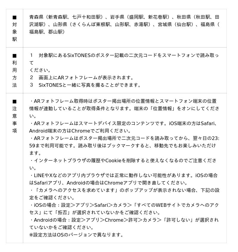 期間中、東北エリア12か所の駅に設置されたポスターに記載の二次元コードを読み取ると、SixTONESのメンバーと写真撮影ができるオリジナルデザインのARフォトフレームをお楽しみいただけます。