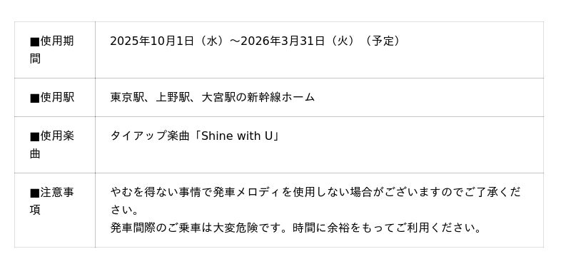 2025年10月1日(水)~2026年3月31日(火)(予定)の間、タイアップ楽曲「Shine with U」をアレンジし、発車メロディとして期間限定で使用します。