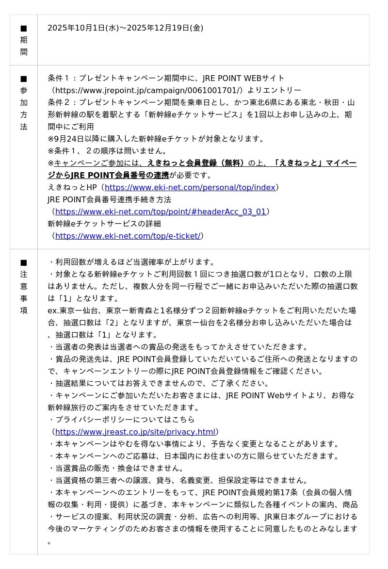 2025年10月1日(水)~2025年12月19日(金)の間、東北6県にある東北・秋田・山形新幹線の駅を着駅とする新幹線eチケットをご利用のうえ、JRE POINTキャンペーンサイト(https://www.jrepoint.jp/campaign/0061001701/)からエントリーするとSixTONESメンバーがデザインされたオリジナル駅名標キーホルダーが抽選で600名様に当たります。