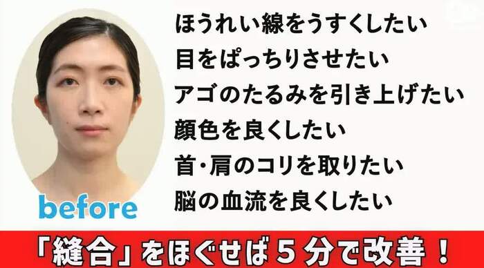 たるみやほうれい線といった「マスク老け」だけでなく、眼精疲労、首・肩こりにも悩んでいたフジテレビュー!!編集部員が、自分でできる「縫合」マッサージを吉田さんにレクチャーしてもらいました。