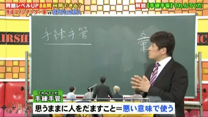 「手練手管(てれんてくだ)」を漢字で書く問題では、林修先生が言葉の意味と使い方を教えてくれました。