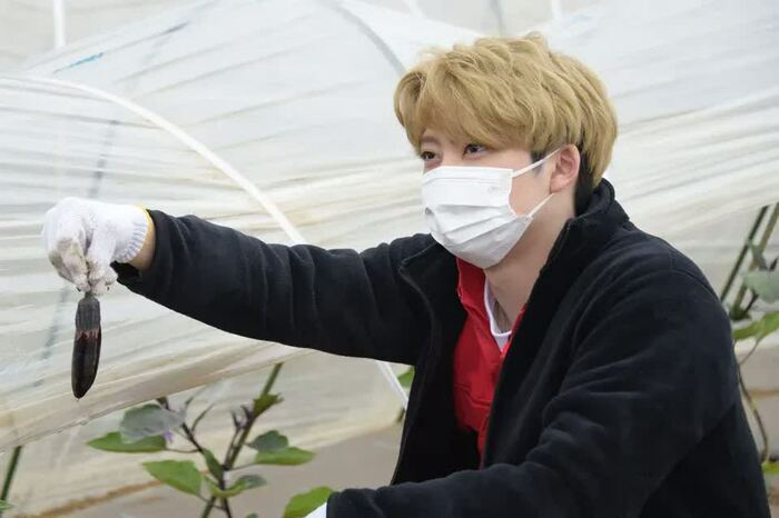 カイさんは小さいナスを手にとって「かわいい!」と夢中。ユーキさんは「思った以上にきつい!うさぎ跳びずっとしている感じ」といい、しゃがみ込む自分の体勢が、超特急のある楽曲の振り付けに似ていると気づきます。