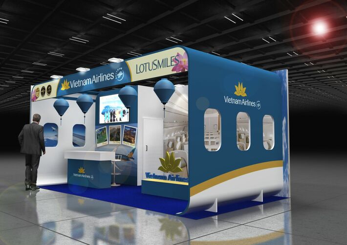 ベトナム航空のブースでは、コーポレートカラーである青色「ベトナムブルー」を基調とした色鮮やかなデザインやキャビンアテンダントをモチーフとしたオリジナル着ぐるみや民族衣装のアオザイをモチーフにしたユニフォームを着用したスタッフが皆さまをお迎えします。ブース内にはまるでベトナム航空の機内にいるかのような記念写真が撮れるフォトコーナーを設けております。