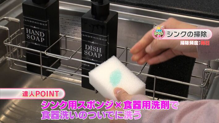 食器洗いが終わったら、シンク用スポンジに食器用洗剤をつけて洗う”ついで洗い”を習慣化することで無理なくお掃除を続けられます。