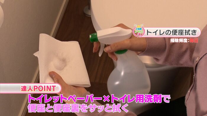 トイレットペーパーにトイレ用洗剤を付けて、便座と裏をサッと拭き掃除しましょう!