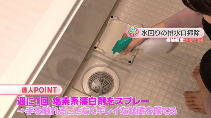 ヌメリや臭いが気になる排水溝は、塩素系漂白剤をスプレーして5分後に水で流すだけで手を触れることなくきれいな状態を保つことができます。