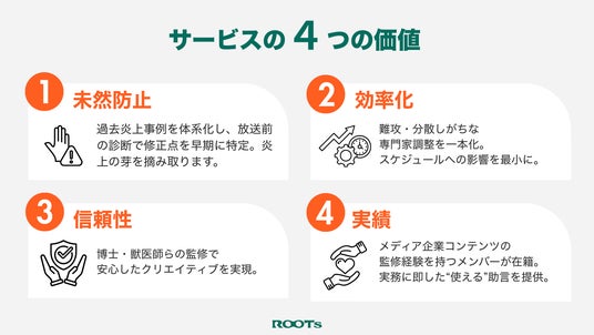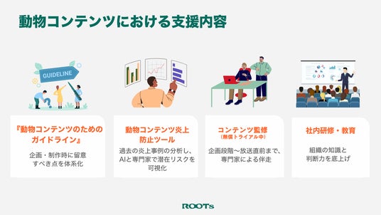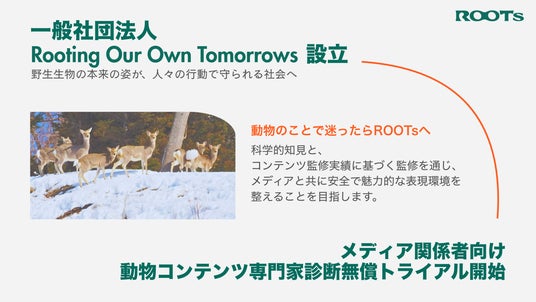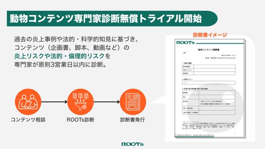 一般社団法人ROOTs(Rooting Our Own Tomorrows、所在地:東京都/代表理事:安家叶子)は、2025年7月の法人化を経て、本日より新サービスを本格的に開始します。本サービスは、テレビ・映画・CM・アニメなどのメディア制作において、動物コンテンツの炎上リスクを未然に防ぎ、制作効率の向上をサポートするものです。これを記念し、メディア企業向けに「動物コンテンツ専門家診断」の無償トライアルを実施します。本日より12月24日までお申し込みを受け付けます。