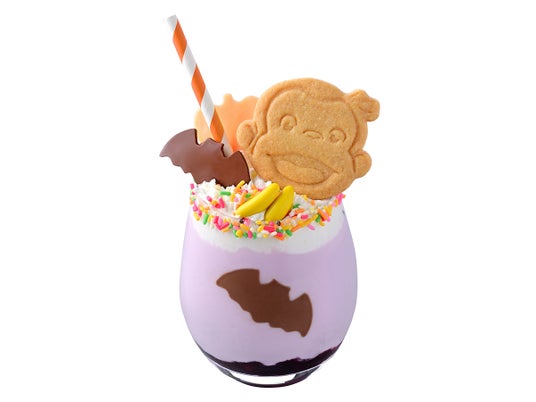 さらには、ハロウィーンパーティーをイメージし、たっぷりのお菓子をトッピングしたドリンクメニュー「ハロウィーンパーティーへご招待!特製!あやしげなパープルドリンク」は、すっきりとしたヨーグルトをベースに甘いブルーベリーソースを合わせました。ジョージのお顔のクッキーは2種類あり、どんなお顔のジョージがやって来るかはお楽しみ!