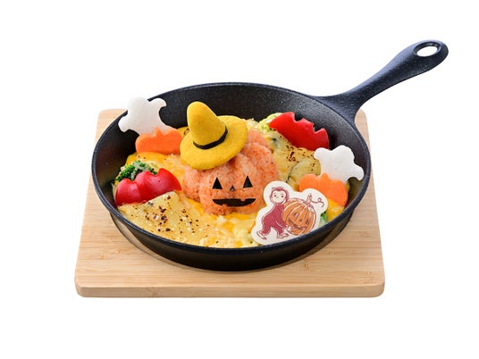 黄色い帽子を被ったかぼちゃ型のケチャップライスが目を引く「大好きなハロウィーンがやってきた!かぼちゃクリームソースのライスプレート ~黄色い帽子のおばけかぼちゃ~」は、クリーミーなかぼちゃソースに塩味の効いたベーコンとチーズを合わせ、おばけやコウモリのモチーフに型抜きした野菜を添えた飽きのこない一皿。ハロウィーンにちなんだ、さまざまなモチーフが詰まったこの時期にぴったりのフードメニューです。