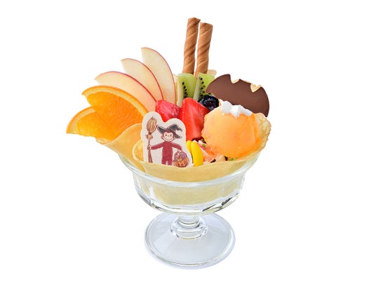 また、魔女に仮装したジョージがかわいい「トリック・オア・トリート!フルーツをくれなきゃいたずらしちゃうぞ!?パフェ」は、5種類のフルーツとオレンジシャーベットがさっぱりとしたデザートメニューです。クレープ生地がパフェグラスに添うように全体を覆い、フルーツやクリームと一緒に食べると、通常のパフェとはまた違った味わいが楽しめます。