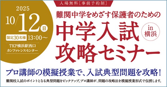 株式会社リソー教育グループ(本社:東京都豊島区、代表取締役:天坊真彦)の子会社である、株式会社名門会(本社:東京都豊島区、代表取締役:吉田信司)は、難関中学受験をめざす保護者の方々を対象に、『中学入試攻略セミナーin横浜』の受付を開始いたします。