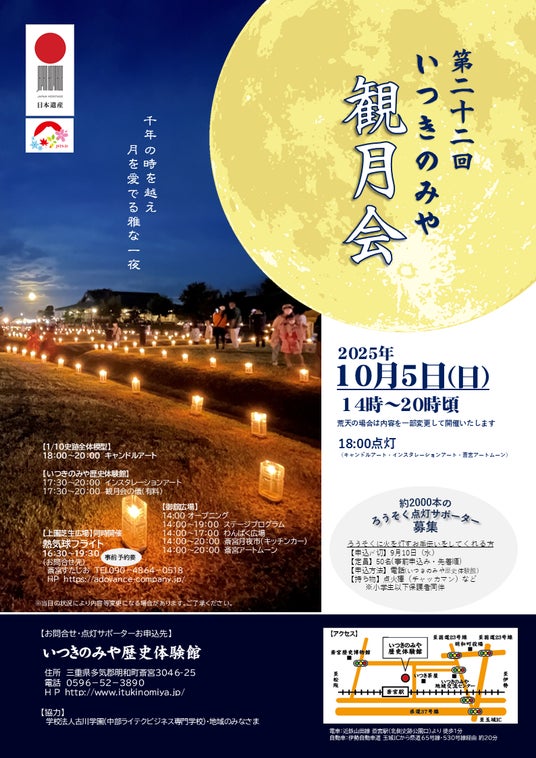 明和町の持続可能な観光地域づくりに取り組む一般社団法人明和観光商社は、三重県明和町・斎宮にて、「第22回 いつきのみや観月会」を 2025年10月5日(日)に開催いたします。斎宮史跡公園周辺およびいつきのみや歴史体験館を舞台に、キャンドルアート約2,000本の灯火、観月会の儀(特別有料プログラム)、飲食ブース「斎宮月夜市」、よさこいや太鼓などのステージプログラム等多彩な催しを予定しております。18時には、約2,000本のキャンドルアート・斎宮アートムーンを点灯いたします。地域の文化資源を活かした本イベントは、歴史情緒を有する場で、住民および観光客双方に対する文化交流と地域活性化を目的としています。荒天時には一部内容を変更して実施いたします。