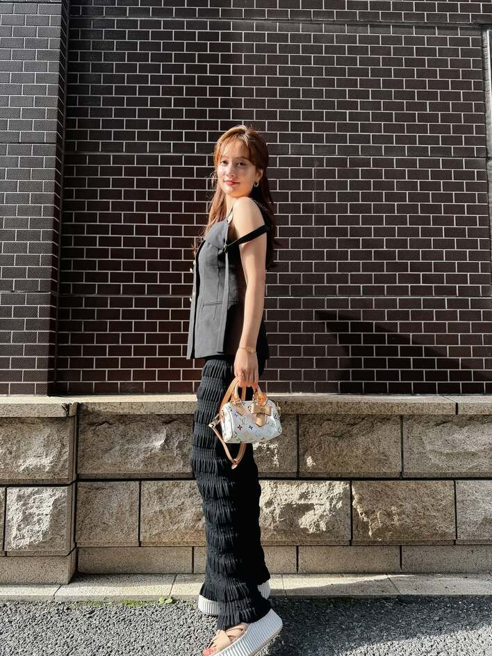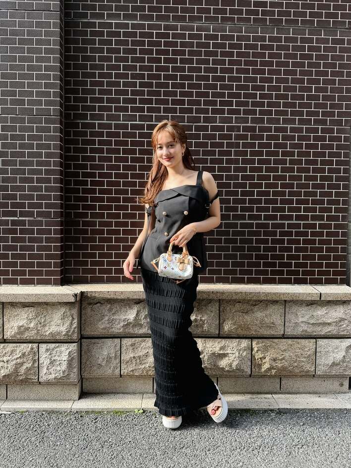 そこには、デコルテ際立つトップスに、ピタッとしたロングスカートを合わせた、全身黒コーデの谷さんの姿が。髪をハーフアップにまとめ、大人な雰囲気を醸し出しています。