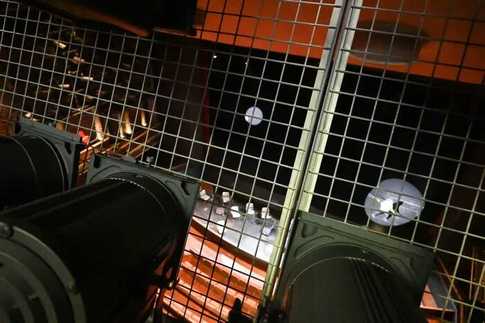 ツアー進行を務める安田武司さん(東京芸術劇場 舞台管理担当課長)から、今日の流れについて説明を受けたら、3グループに分かれてツアー開始です。私たちがまず向かったのは「第二シーリング(ピンルーム)」。客席後部、ほぼ天井に近い高さから演者に光を当てる装置です。