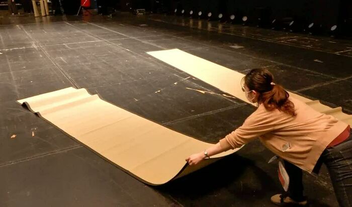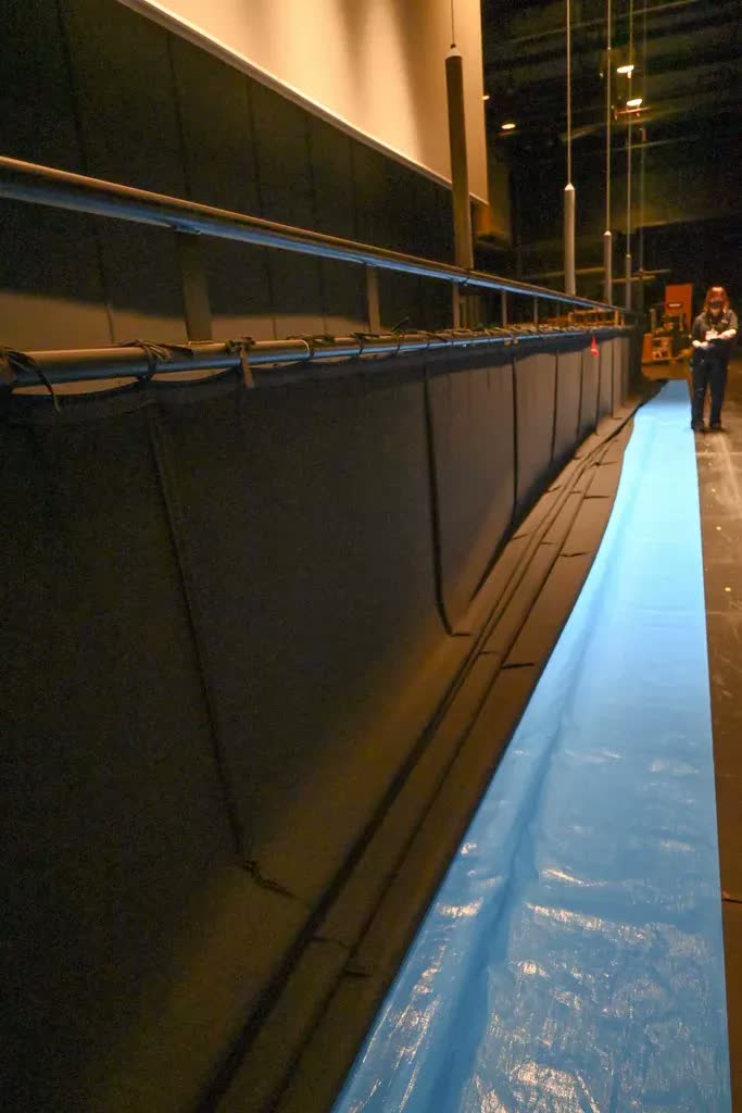 通常、幕は舞台の上の空間にある“バトン”と呼ばれる棒に吊り下げられています。幕を下ろすときは、幕が汚れないよう、床に長〜いブルーシートを敷きます。
