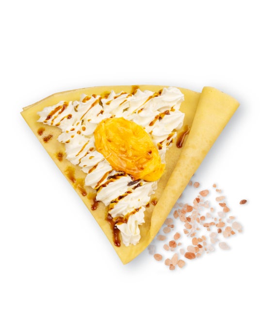 おさつペースト、ホイップ、濃厚なキャラメルソースに、岩塩をアクセントにした甘じょっぱさがクセになるクレープ。