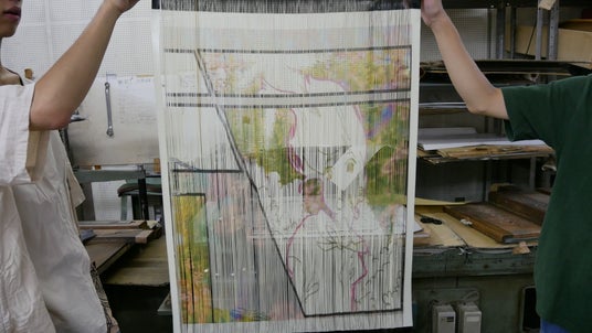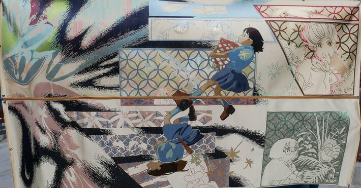 岡本織物株式会社(京都市上京区 代表取締役:岡本圭司)は、京都・西陣に伝わる織の技術「引箔」を用い、若手マンガクリエイターユニット「ぐらにゅーとー」との協働による新作タペストリー『ひゅらん。』(約250cm×140cm)を製作しました。