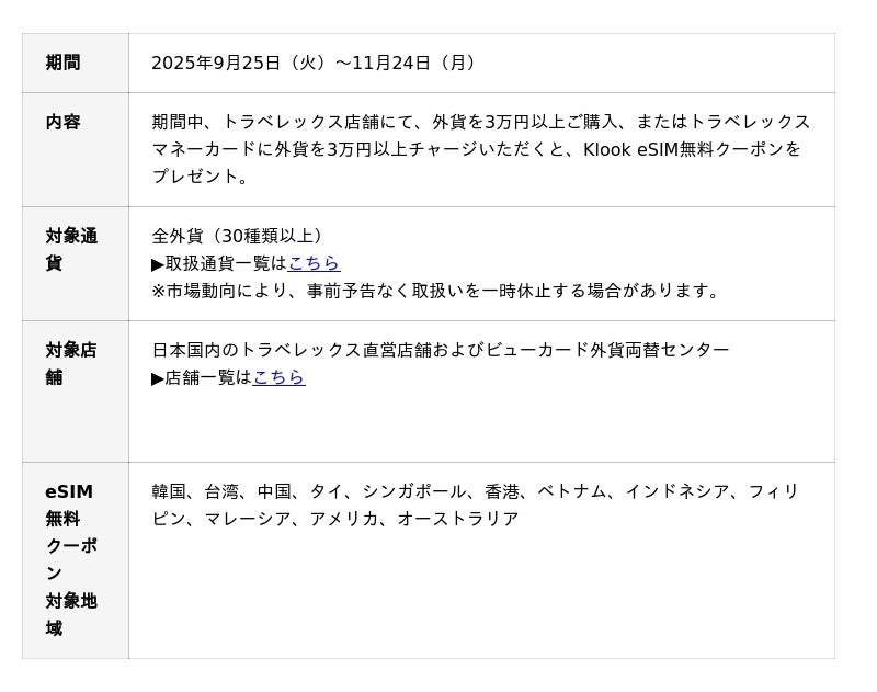 トラベレックスジャパン株式会社(本社:東京都港区、代表取締役:大谷淳)は、 Klook Travel Technology Limited(本社:香港、共同創業者兼CEO:イーサン・リン)と共同で、2025年9月25日(木)から11月24日(月)の期間、「秋のeSIM無料キャンペーン」を実施いたします。本キャンペーンでは、国内トラベレックス店舗で外貨両替をいただだいたお客さまに、Klook eSIM無料クーポンをプレゼントいたします。