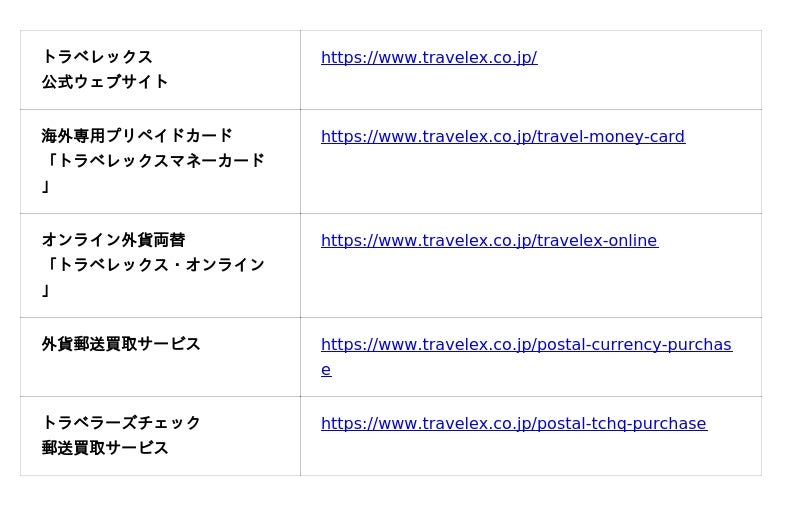 1976年に英国で創業したトラベレックスは、世界20以上の国と地域に600以上の店舗を展開するグローバル企業として、安心・便利な外貨両替サービスを提供しています。日本国内では60以上の外貨両替店舗を運営しており、オンライン注文によるご自宅や店舗での外貨受け取りにも対応。外貨現金の両替に加えて、海外専用プリペイドカード「トラベレックスマネーカード」など、海外旅行や留学に便利なサービスを提供しています。