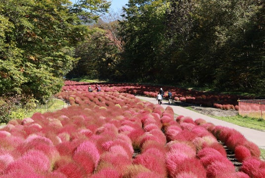 ■約 8,000 平方メートル の斜面に広がる1万株のコキアと1万株の園芸種が織りなす色彩豊かな花絨毯を展開