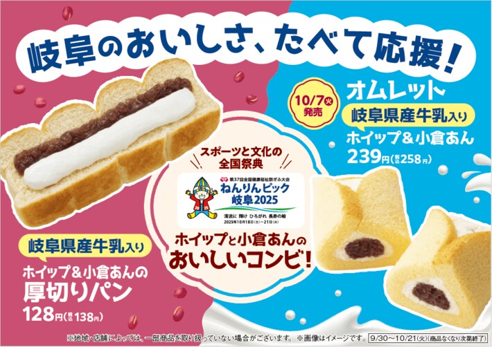 株式会社ファミリーマート(本社:東京都港区、代表取締役社長:細見研介)は、継続して取り組んでいる5つのキーワードの1つである「『あなた』のうれしい」の一環として、岐阜県と連携し「ねんりんピック岐阜2025」の開催にあわせて、岐阜県産牛乳を使用した「岐阜県産牛乳入りホイップ&小倉あんの厚切りパン」128円(税込138円)、「オムレット岐阜県産牛乳入りホイップ&小倉あん」239円(税込258円)の2種類を2025年9月30日(火)から順次、東海地方(愛知県、岐阜県、三重県一部店舗、静岡県一部店舗)のファミリーマート約2,500店で発売いたします。
